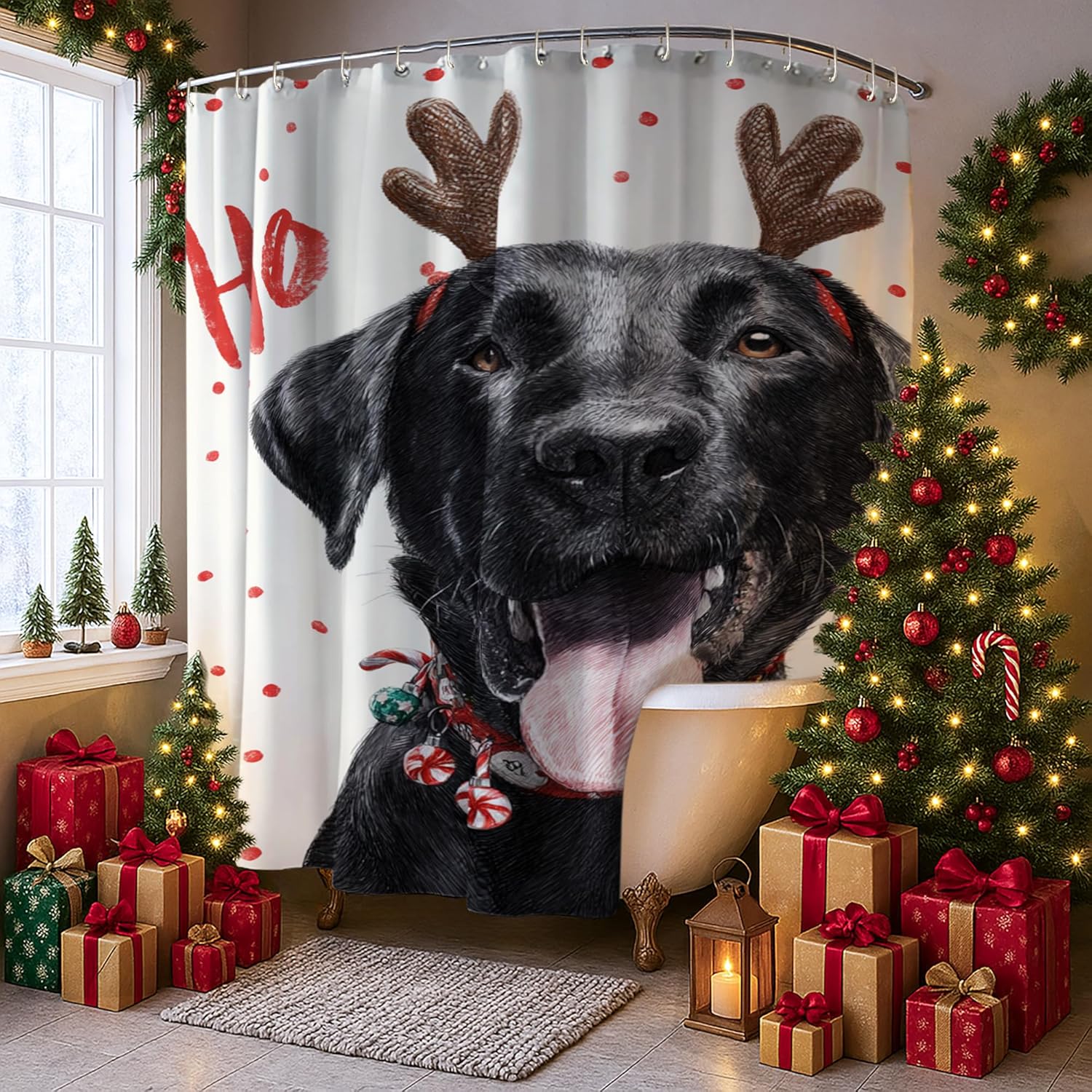 4Pcs Christmas Dog Shower Curtain Set, White Red Polka Dot Bath Mat Rugs Accessories for Bathroom Decor, Festive Modern Waterproof Fabric Shower Curtain Set with Hooks